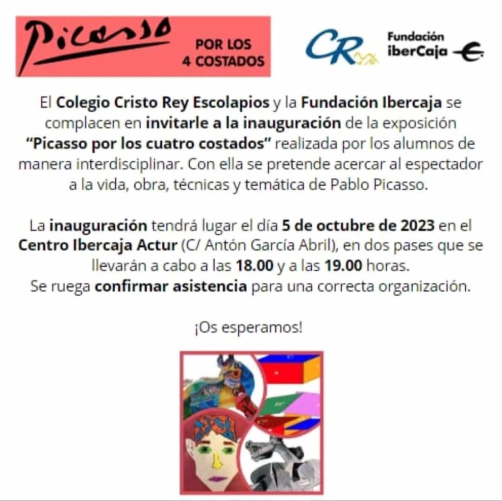 Con motivo del 50 aniversario de la muerte de Picasso, nace Picasso por los cuatro costados, exposición realizada por el alumnado del colegio Cristo Rey de Zaragoza, en las asignaturas de Plástica y Visual, Geografía e Historia y los ámbitos de Desarrollo de Capacidades.